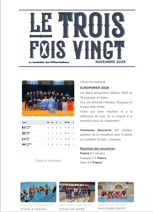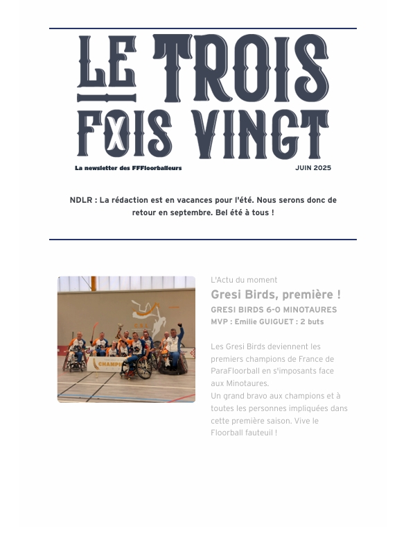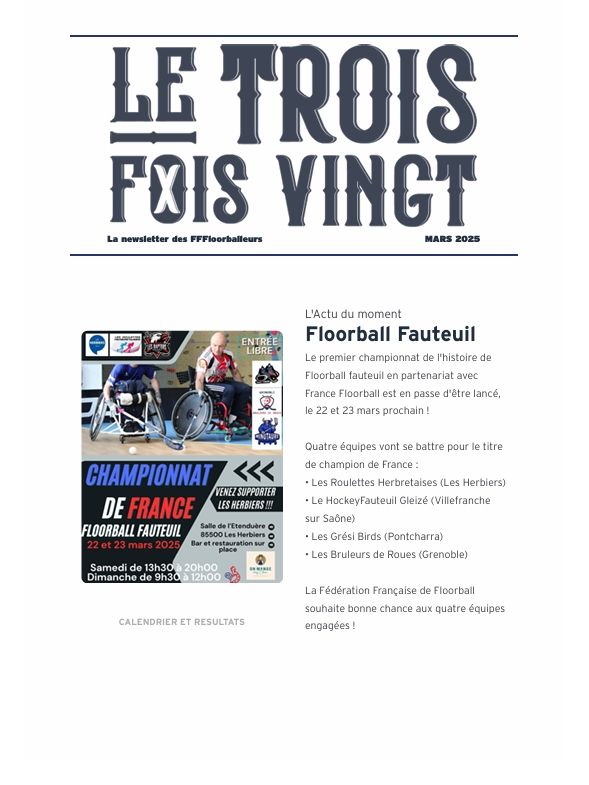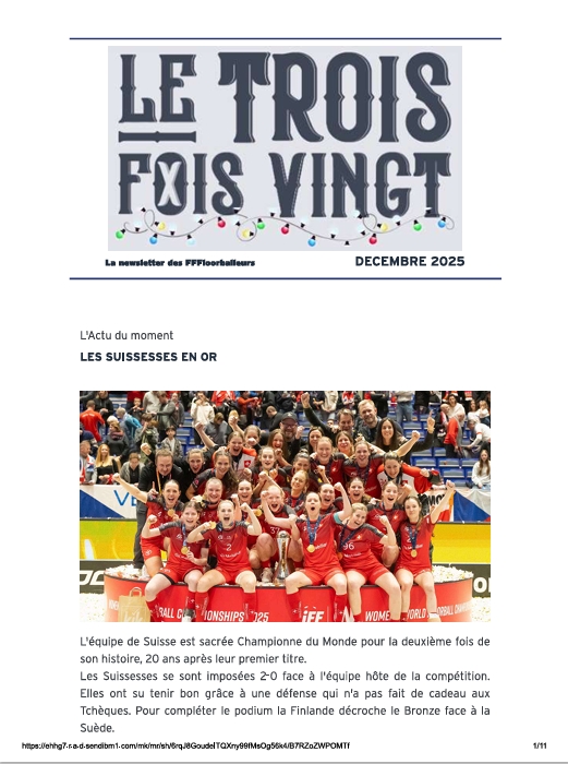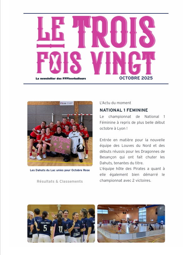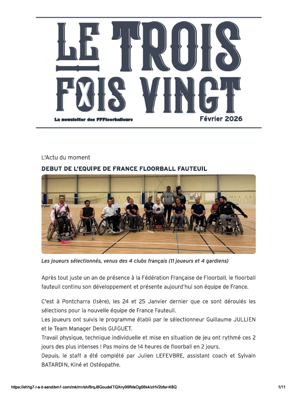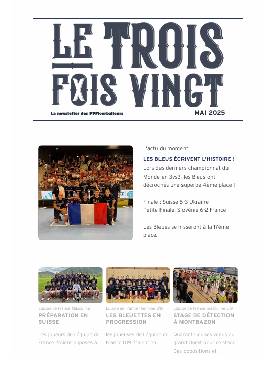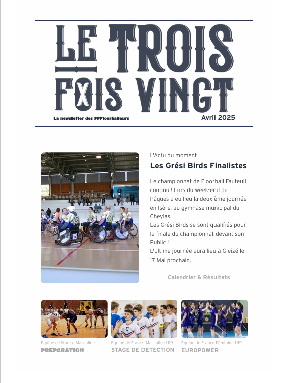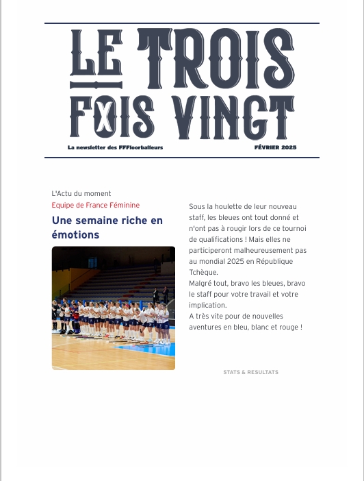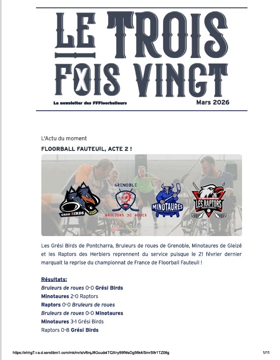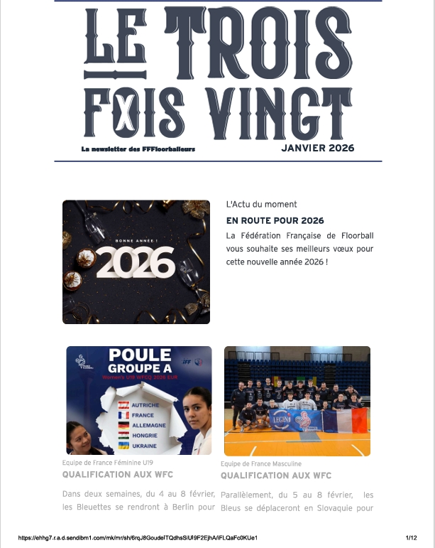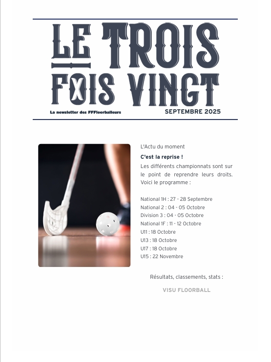 NEWSLETTERS La newsletter des FFFloorballeurs ! Le Trois Fois Vingt 2026 La newsletter de Janvier 2026 La newsletter de Février 2026 La newsletter de Mars 2026 Lire Lire Lire Le Trois Fois Vingt 2025 La newsletter de Décembre 2025 La newsletter de Novembre 2025 La newsletter de Octobre 2025 La newsletter de septembre 2025 Lire Lire Lire Lire La newsletter de Juin 2025 La newsletter de Mai 2025 La newsletter de Avril 2025 La newsletter de Mars 2025 Lire Lire Lire Lire La newsletter de Février 2025 Lire